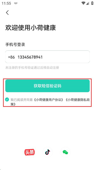 4、勾选同意用户协议隐私政策,点击获取短信验证码。