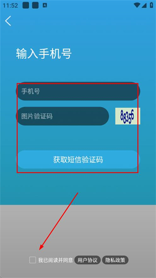 3、在输入手机号、图片验证码,勾选同意协议,点击获取短信验证码完成注册。