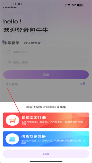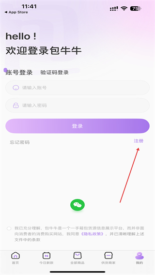 1、打开包牛牛APP,进入时点击下方登录/注册的按钮。