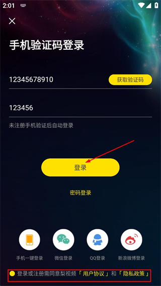 4、勾选登录或注册需同意梨视频用户协议和隐私政策,点击登录按钮。