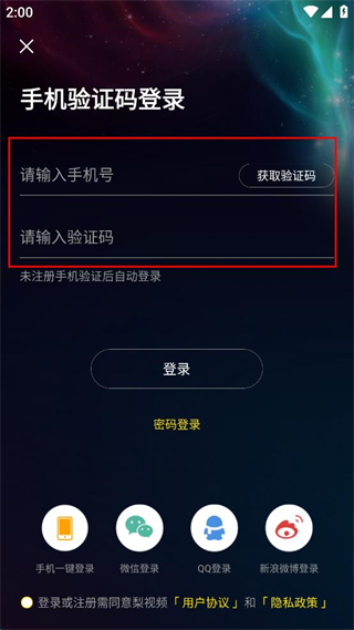 3、在手机验证码登录界面的请输入手机号栏输入手机号,点击获取验证码并输入验证码。