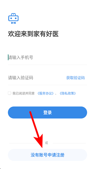 1、打开家有好医APP,在登录页面点击没有账号申请注册选项。