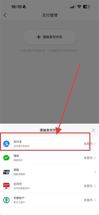 4、在弹窗中选择支付宝选项,按照提示操作即可完成支付宝绑定。