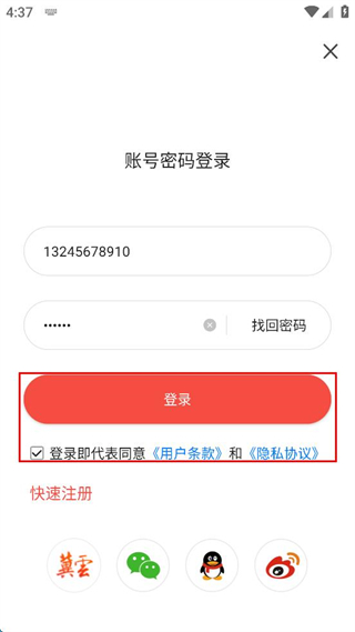 4、勾选登录即代表同意用户条款和隐私协议,点击登录按钮。