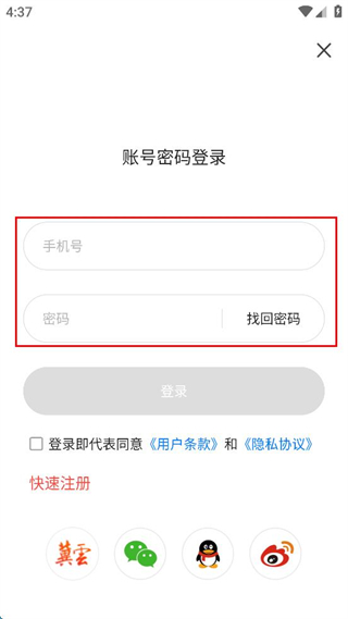 3、在账号密码登录界面的手机号栏输入手机号,在密码栏输入密码。