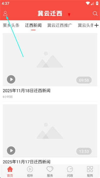 1、找到冀云迁西首页的个人图标选项,点击个人图标。