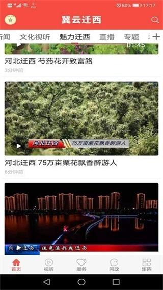冀云迁西是迁西县融媒体中心官方手机客户端。是一款集广播电视直播、点播、生活服务等全方位的生活应用移动客户端产品。包括新闻推荐、关注、视频、教育、旅游、悦读、点播、直播、生活服务等众多板块。通过个性化的精准推荐为迁西人民提供生活资讯服务,成为迁西人民“一手掌握迁西”的公共服务传播平台。