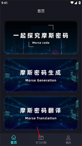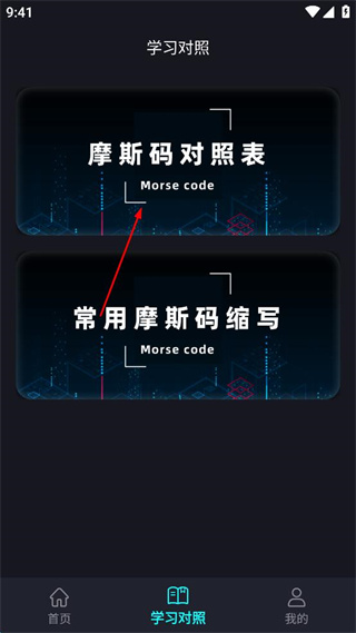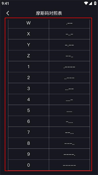 2、点击“摩斯码对照表”选项,进入摩斯码对照表界面。