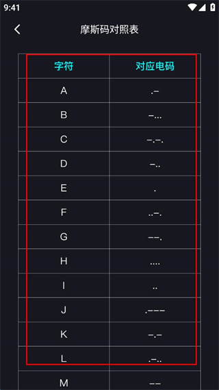 3、在摩斯码对照表界面中,查看A到L等字符对应的电码内容。