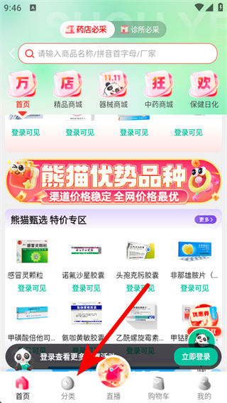1、打开熊猫药药APP,点击底部我的,进入个人页面后点击立即登录。
