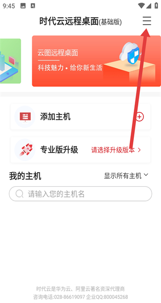 1、打开时代云远程桌面APP,点击右上角的三条横线菜单按钮,弹出功能菜单。