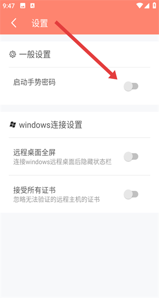 3、在设置界面,点击启动手势密码的开关按钮,进入设置手势密码界面。