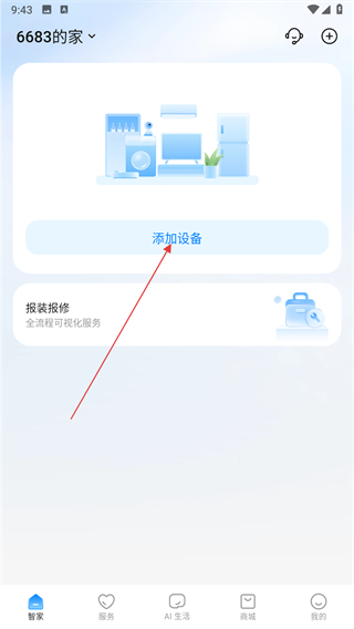 1、打开海尔智家APP,点击智家页面中的添加设备选项,进入添加设备。
