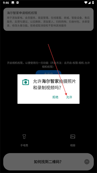3、在提示框中点击允许按钮,开启相机权限后进入扫码添加设备页面。