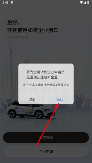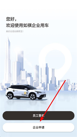 1、打开如祺出行企业版,在欢迎界面点击企业申请。