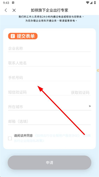 3、在页面填写企业名称、姓名、手机号码、等信息,勾选同意相关协议,点击申请按钮,提交企业申请。