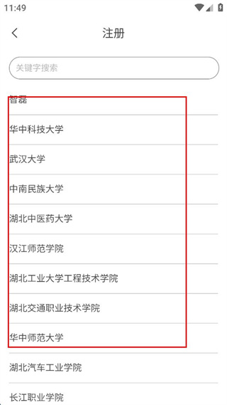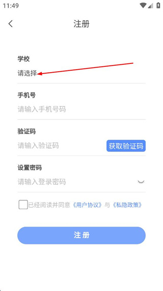 3、在学校选择列表中选择相应学校,然后输入手机号、验证码和设置密码。