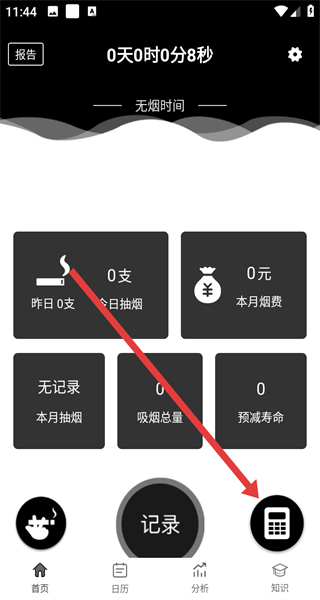 1、打开戒烟统计类APP,点击右下角的计算器图标,进入计算器界面。
