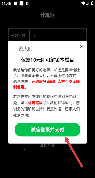 4、在解锁提示弹窗中,点击微信登录并支付按钮,完成支付后,解锁该计算器栏目。
