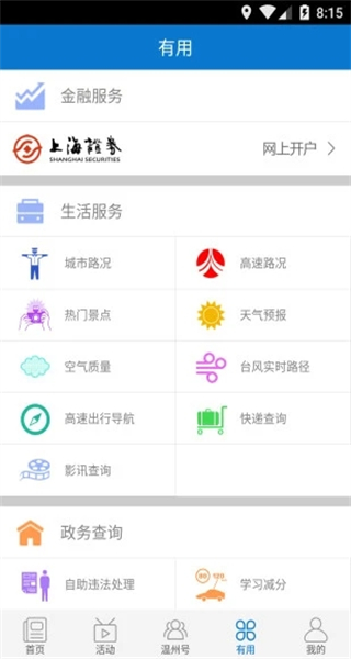 温州各大企事业单位的掌上服务窗口,强大的生活服务工具:查社保、查医保、查公积金、查违章、水电气费查缴、手机银行、出行路况、景区景点实时画面、订餐、订票……提供各类会员卡、社区活动资讯……