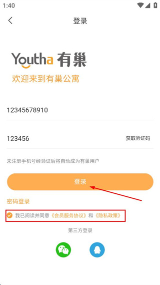 4、勾选同意会员服务协议和隐私政策,点击“登录”按钮完成登录。