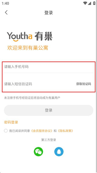 3、在登录界面输入手机号码和短信验证码,准备进行登录操作。
