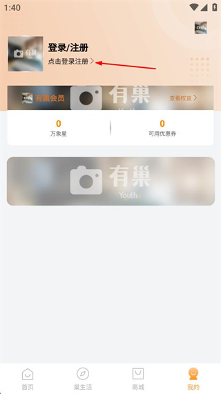 2、点击“登录/注册”区域,进入登录界面。