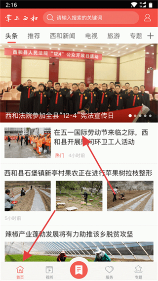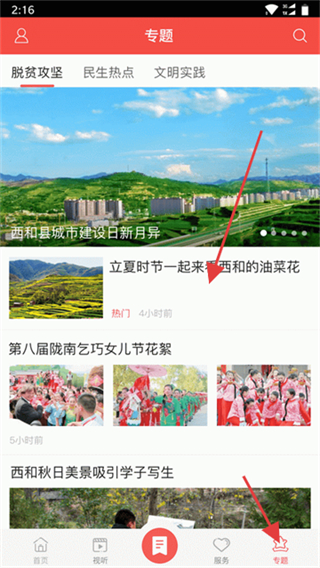 1、在首页可查看西和新闻、头条推荐等各类资讯,了解本地最新动态;专题板块有脱贫攻坚、民生热点等专题内容。