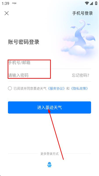 4、输入账号和密码,点击进入墨迹天气即可完成登录。