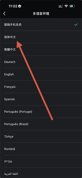 4、在多语言环境页面,选择要切换的语言,如简体中文,即可完成语言设置切换。