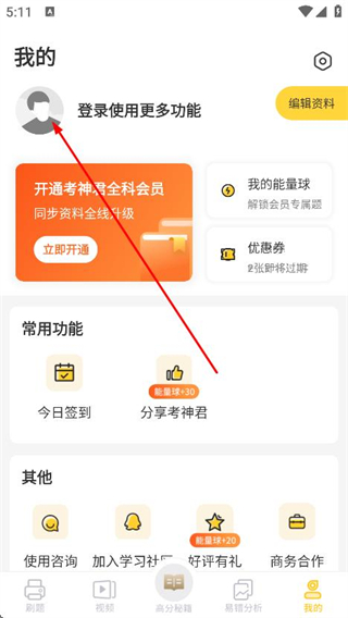 2、在我的页面点击上方的头像区域,进入登录/注册界面。