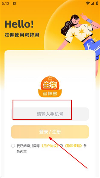 3、在登录界面的输入框内,填写手机号,点击登录/注册。