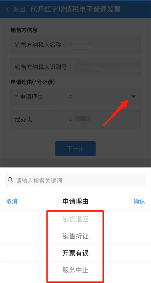 3、人脸识别验证成功后,页面跳转至申请理由填写页面,点击“申请理由”,请务必真实选择申请理由,确认选择后点击“下一步”;