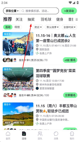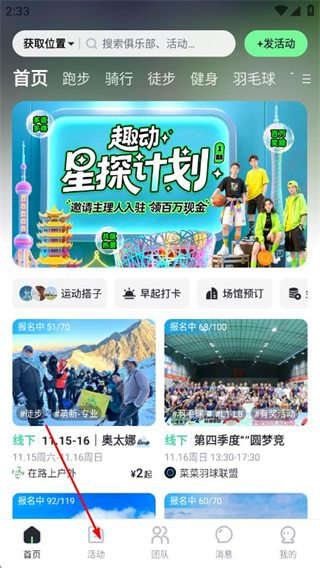 1、打开趣动APP,点击底部活动,进入活动页面。