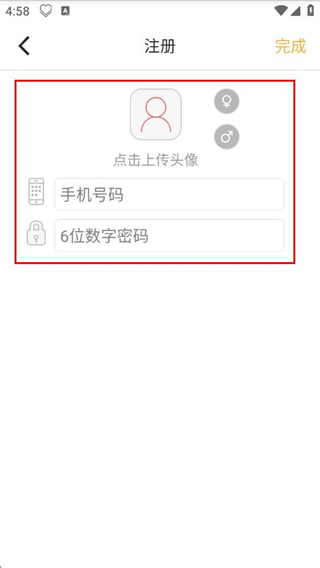 2、在注册界面上传头像,选择性别,输入手机号码和6位数字密码。完成信息填写后,点击“完成”,