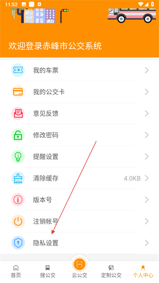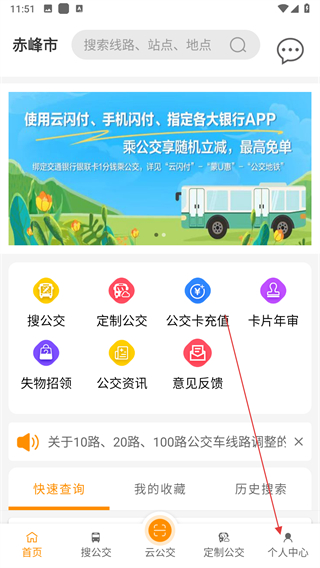2、在个人中心,点击底部“首页”,回到主界面,可看到搜公交、定制公交等功能入口及公交资讯。