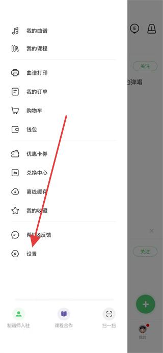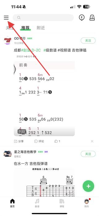 1、打开吉他世界APP,点击左上角三条横线菜单图标,展开功能列表。