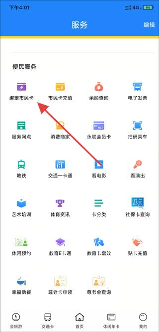 2、在服务页面点击绑定市民卡,进入添加卡号页面。