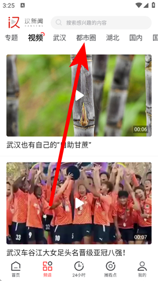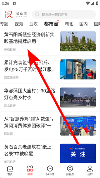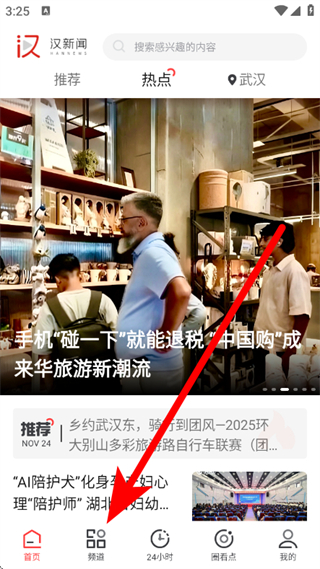 1、打开汉新闻,点击底部频道,进入频道管理页面。