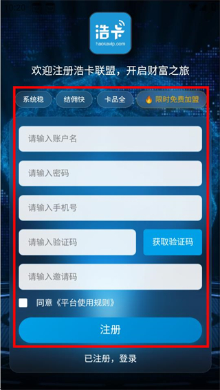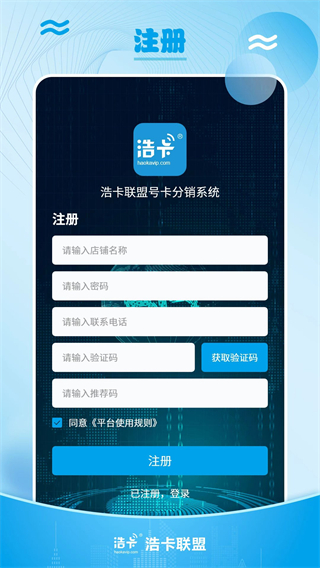 浩卡是一款聚焦号卡推广与流量卡代理的一站式服务平台,整合优质号卡资源与代理扶持体系,为用户提供号卡推广、订单管理、佣金结算等全流程服务,无需复杂门槛,轻松开启代理之路,适配个人创业者与团队推广需求,搭建起高效便捷的号卡代理生态,让推广更省心、收益更可观,彻底打破传统代理模式的繁琐限制。