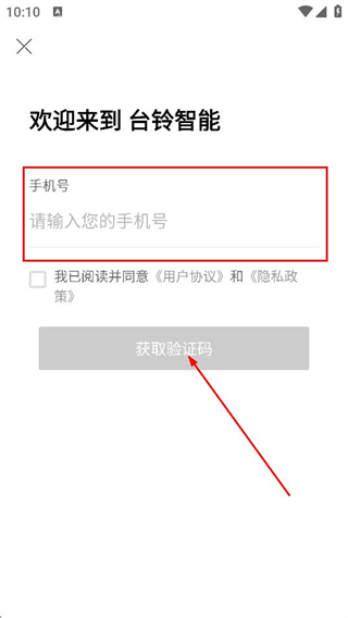 2、在台铃智能登录界面,输入手机号,点击获取验证码。