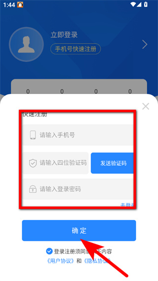 4、在快速注册页面,输入手机号、四位验证码和登录密码后点击确定按钮,即可完成注册操作。