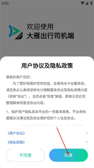1、进入大雁出行司机端的用户协议及隐私政策页面,阅读相关内容后点击同意按钮,完成协议确认步骤。
