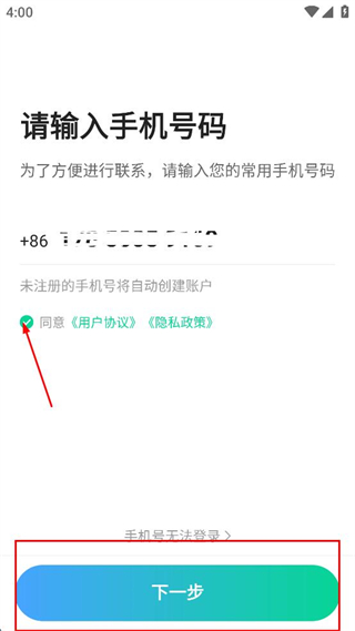 3、勾选同意用户协议及隐私政策的选项,随后点击页面下方的下一步按钮,推进注册操作。