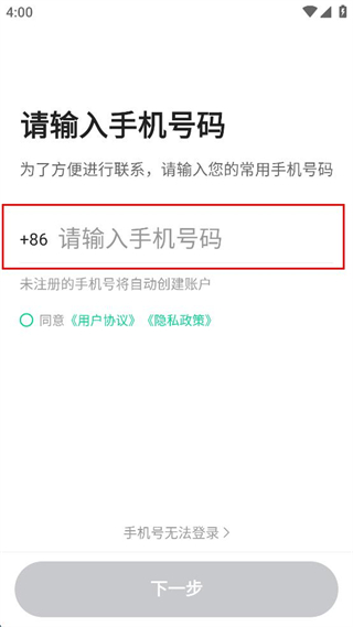 2、进入请输入手机号码页面,在对应输入框中填写常用的手机号码,准备进行后续的注册流程。