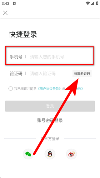 3、在快捷登录页面,输入手机号,点击获取验证码。