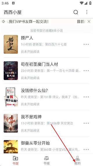 1、在西西小屋书架页面,点击底部我的,进入个人中心页面。