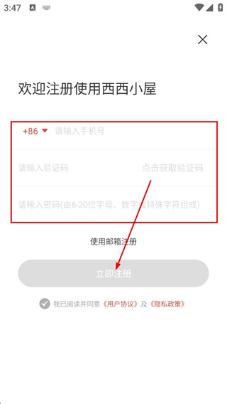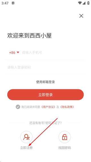 3、在登录界面,点击立即注册按钮,进入西西小屋的注册页面。