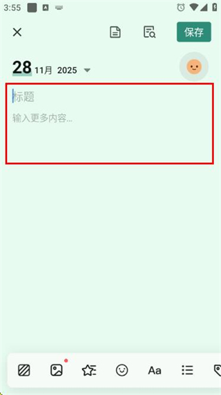 2、在日记编辑页面,填写标题及内容区域的内容。