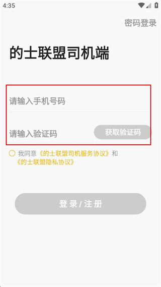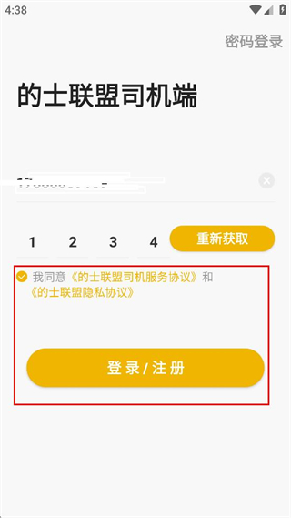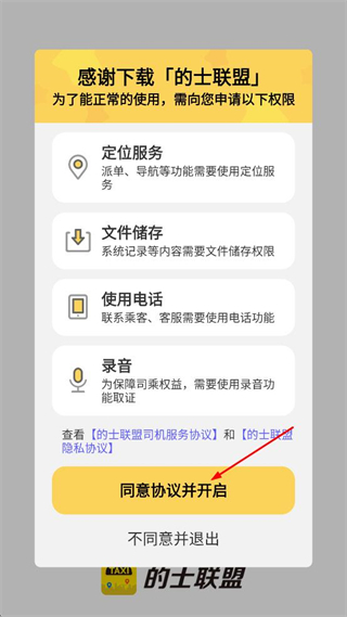 1、打开的士联盟应用,在权限申请窗口点击“同意协议并开启”,进入登录相关界面。